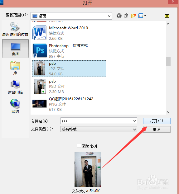 3、然后选择一张照片(鼠标点击左上角的文件,出现下拉菜单,选择打开,之后会出现一个对话框,选出你要加水印的图片,选定后点击右下角的打开即可)见下图。