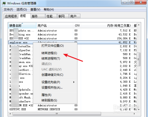 3、在进程中找到explorer.exe,鼠标右击打开菜单项选择“结束进程”