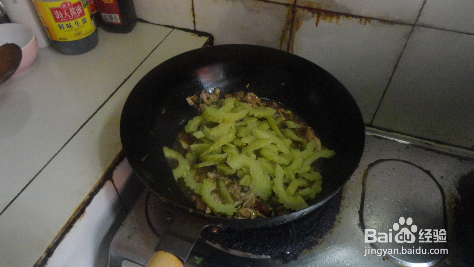 4、锅中烧干水分,放入一些菜籽油,再把肥肉部分放进锅里煸出油脂,出油差不多的时候放进大蒜片和瘦肉快速煸炒,加入苦瓜和小葱一起翻炒,加入食盐,鸡精,酱油等调料一起翻炒均匀。
