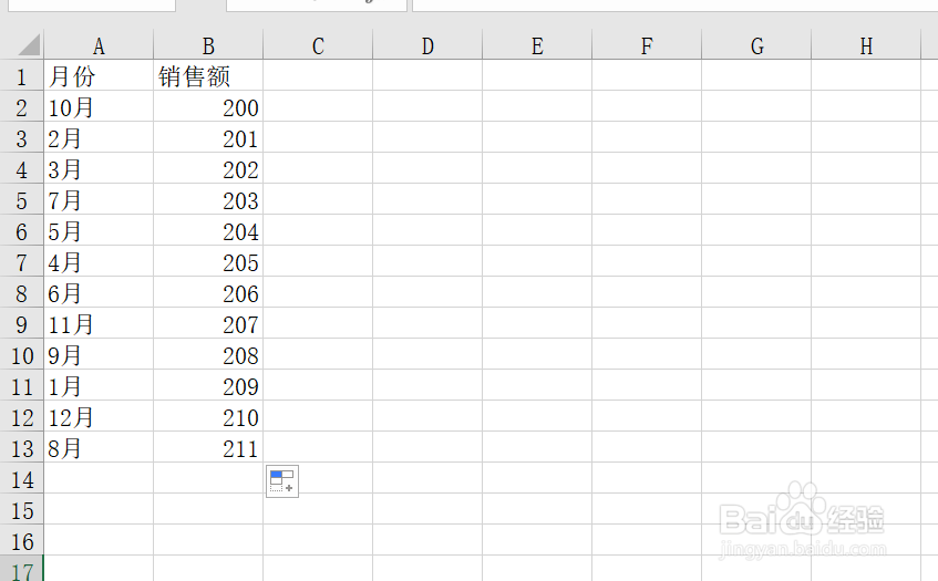 1、本例中,需要将下图中的月份按照月份升序排列,可以这么做,首先,打开需要排序的Excel表格。