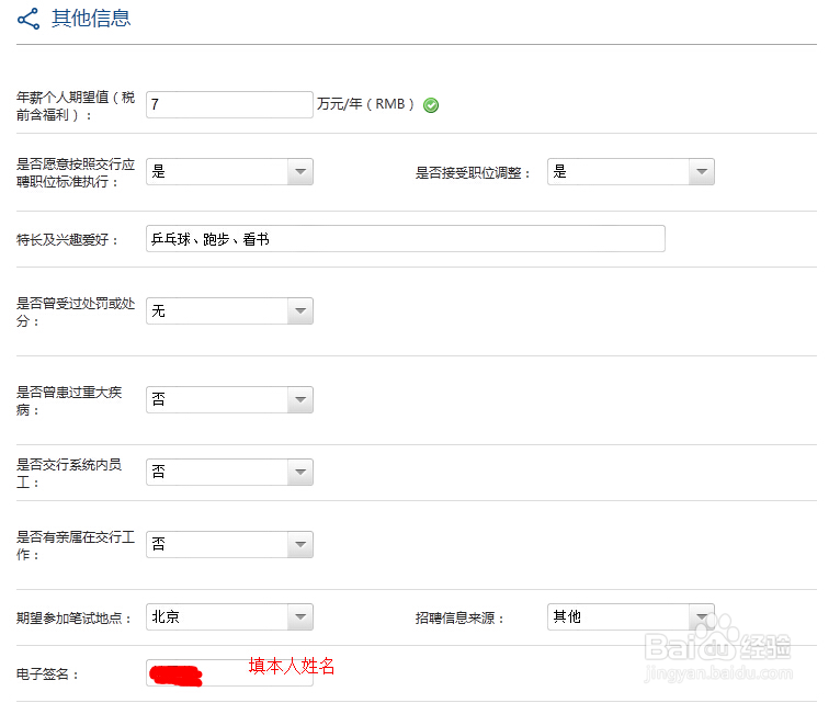 14、其他信息:期望年薪一般比当地平均薪资水平持平即可,笔试地点就近选择,不一定要去报考的银行所在地,电子签名填写自己的姓名即可。