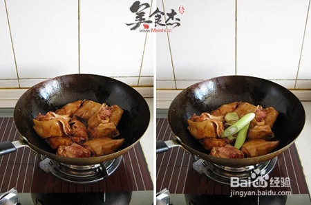 2、猪蹄开始上色后,继续保持中小火翻炒,然后加入料酒、老抽炒出香味,直到猪蹄变成棕红色后放入葱、姜、香叶、八角