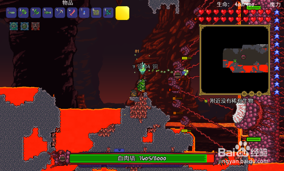 2、一直往下挖来到地狱,将向导巫毒娃娃扔进地狱岩浆中,召唤肉山。