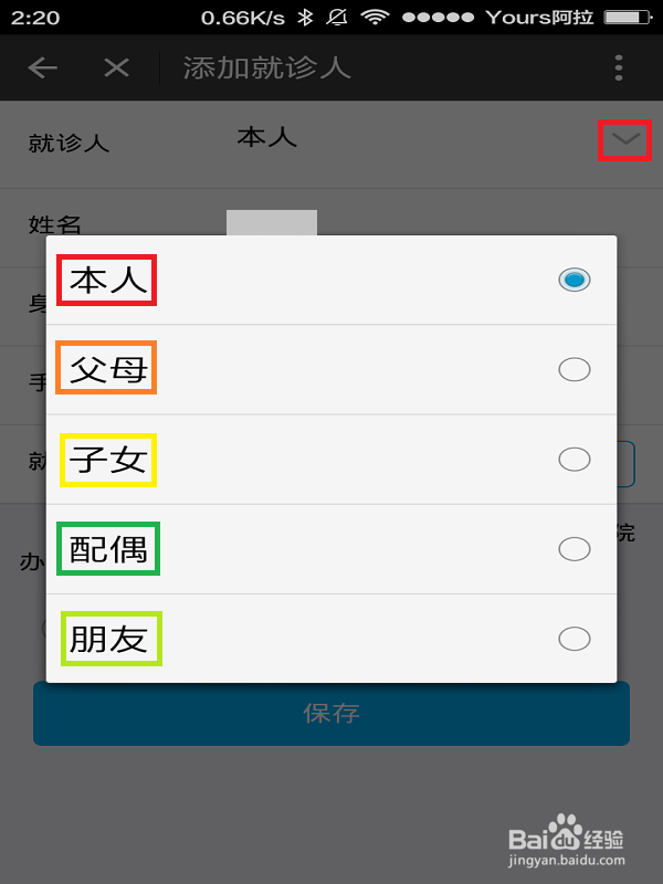 13、在“添加就诊人”的页面,点击右上角的箭头,按照需求可选择“本人、父母、子女、配偶、朋友”,若有医保卡或则其他就诊卡之类的,记得录入,添加成功后,点击保存