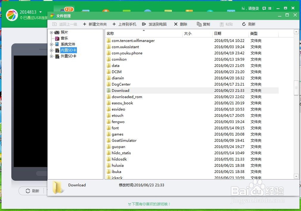 3、然后下载一个手机助手,应该什么都可以,我下的是360的,把安装包上传到手机,那个储存卡都行