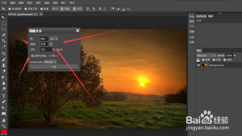 2、调整图片大小尺寸,所以点击图像→图像大小,并调整成想要的大小,比如这里我就设置成宽800PX,高450PX,然后点击OK。