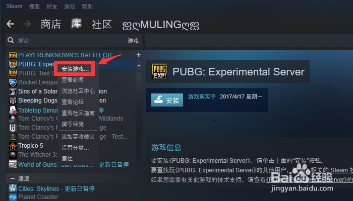 五、我们从自己的“库”中找到游戏所在,右击它选择“安装游戏”。