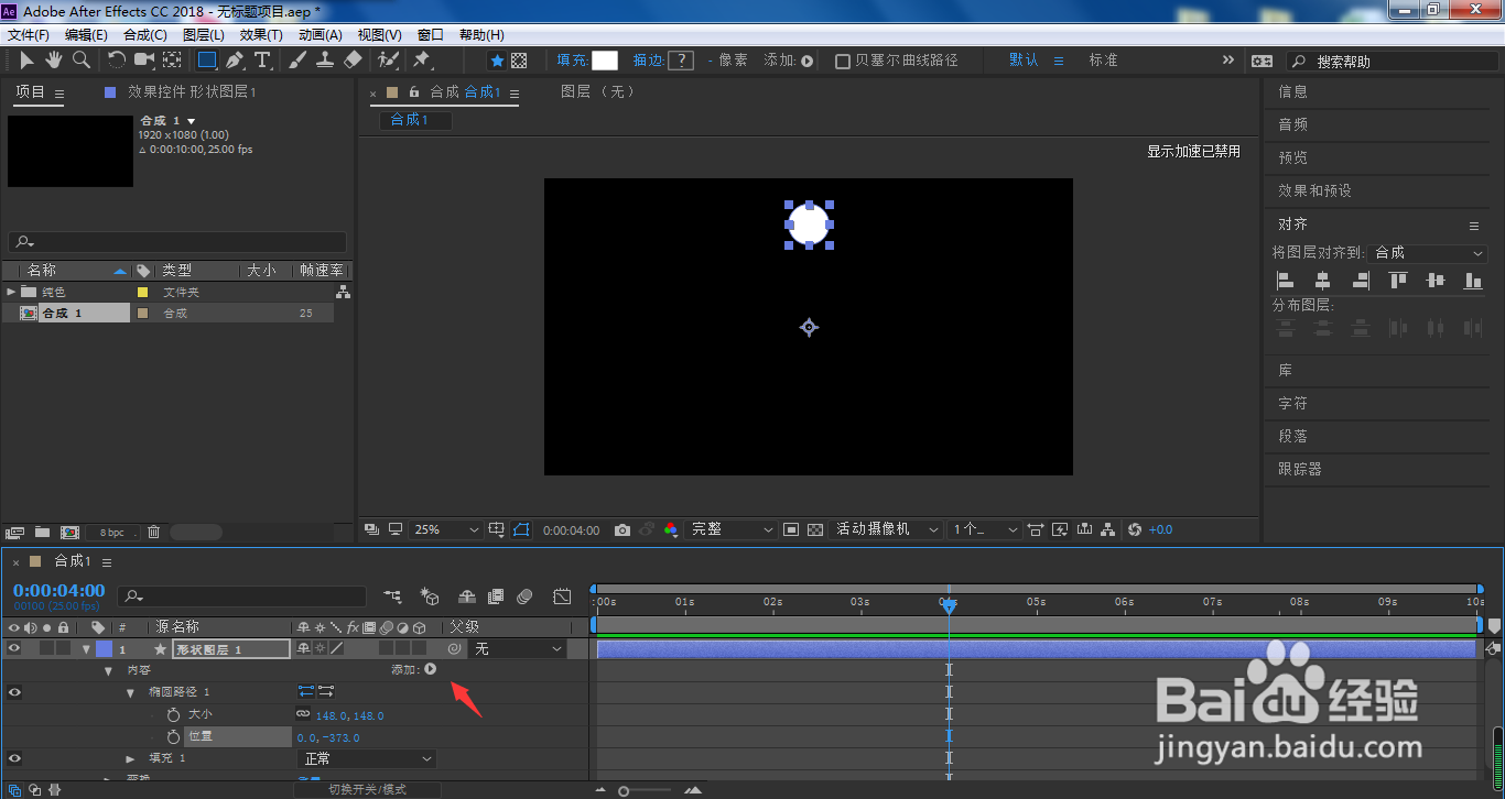 2、然后调整位置属性的Y参数,让圆形可以绕着锚点做旋转运动