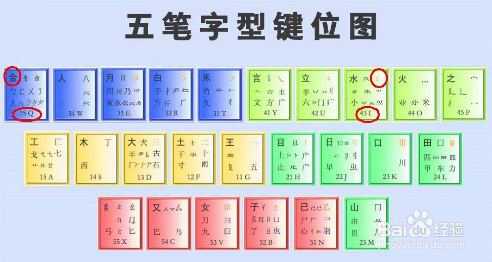 2、再看看分解的字根在哪个键盘的,“氵”在键盘“I”,“金”在键盘“Q”。