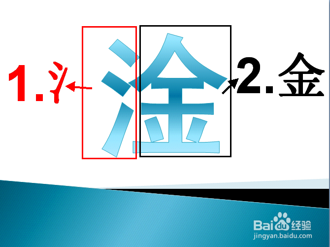1、首先分解“淦”字的五笔字根,五笔的拆分原则“书写顺序,取大优先,兼顾直观,能连不交,能散不连”。“淦”是左右结构,它的字根可以的分解为:“氵”和“金”。