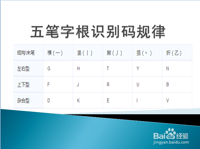 3、可是输入“TQ”后,“淦”字没有打出来,这时就要增加一个五笔字根识别码“G”。五笔字根识别码规律详见下图,“淦”是左右结构,最后一笔是“一”,所以它的识别码是“G”。