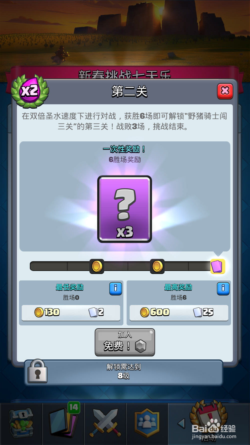 2、 第二关双倍圣水,六胜后获得3018金币,三张随机紫卡。可以说是也能稳拿到手。