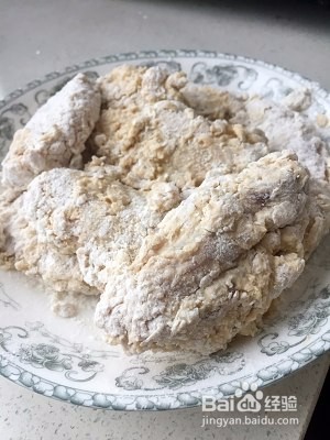 3、将鸡翅裹上一层混合好的粉末