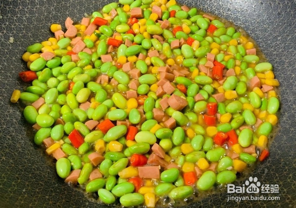 6、放入毛豆,玉米,小米椒,生抽,盐,白糖翻炒,在这救孝丽过程中可以继续加入清水,一来保持湿润,二来熟的更快些。