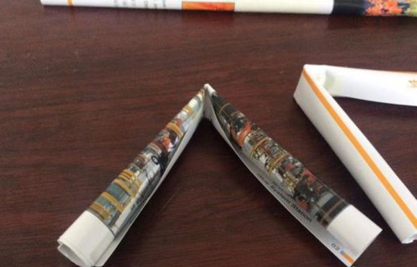 4、第四步:然后将短折叠纸粘到长纸管上,如下图所示。