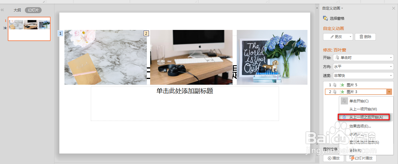 4、按照步骤2-3设置另外一张图片,然后按照图示设置第二张图片的动作为从上一项之后开始,具体如图所示: