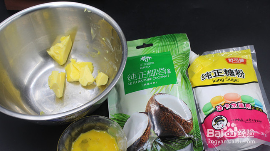 1、准备椰蓉馅料:椰蓉100克 黄油50克 糖粉30克 全蛋液40克