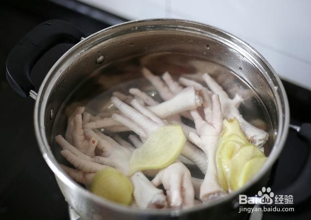 3、将鸡爪冷水下锅,再加入姜片和料酒,大火煮沸后,转中火焯烫2分钟捞出