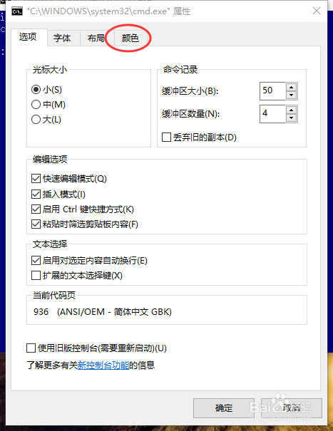 6、在颜色界面中选择颜色后,点击确定按钮即可进入更改完毕的屏幕背景颜色文字命令提示符窗口(红色圆圈区域)