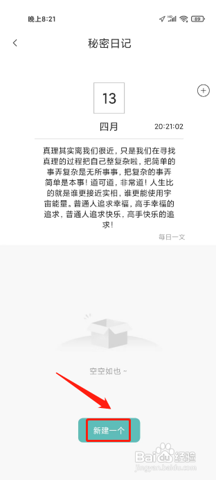 1、打开文案狗APP秘密日记页面,点击“新建一个”进入,如图。