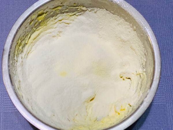 7、筛入与盐和奶粉混合后的低筋面粉。