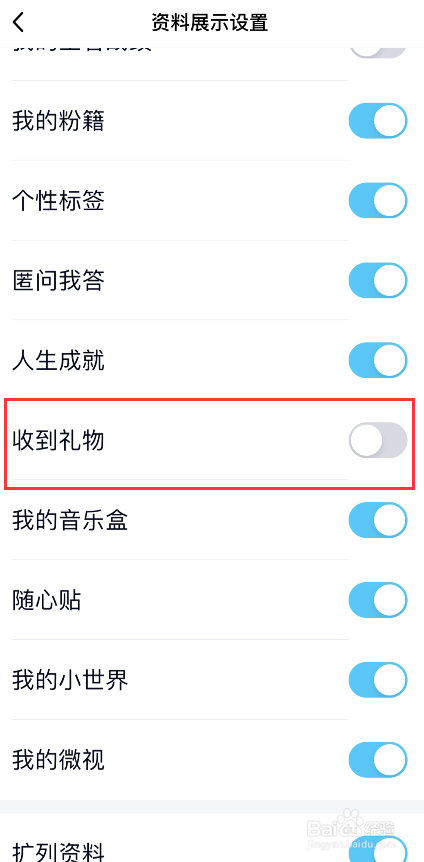 5、下滑找到收到礼物,点击关闭