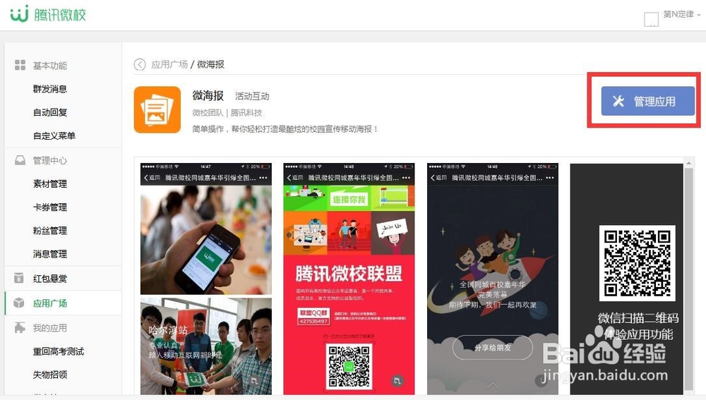 3、选择“开眠何启应 用”,成功后,进入“管理应 用”页面。如下图: