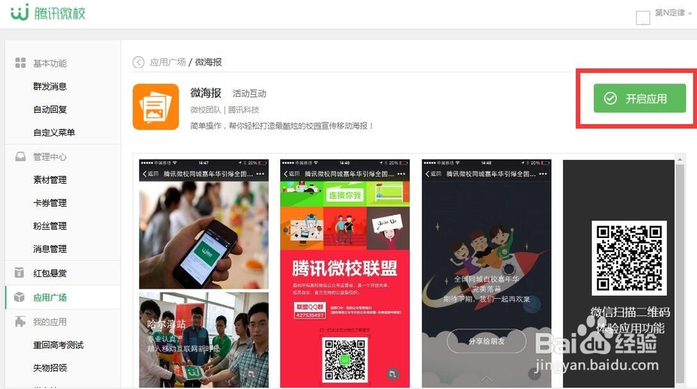 2、找到并点击进入“应 用广场”,在“活动互动”里进入“微海报”应 用页面。如下图: