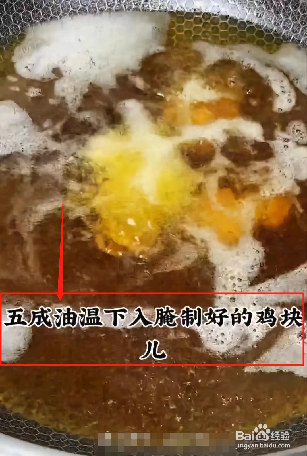 13、第十三步,五成油温下入腌制好的鸡块。