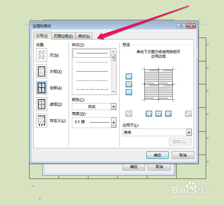 5、进入边框和底纹页面,选择底纹按钮。