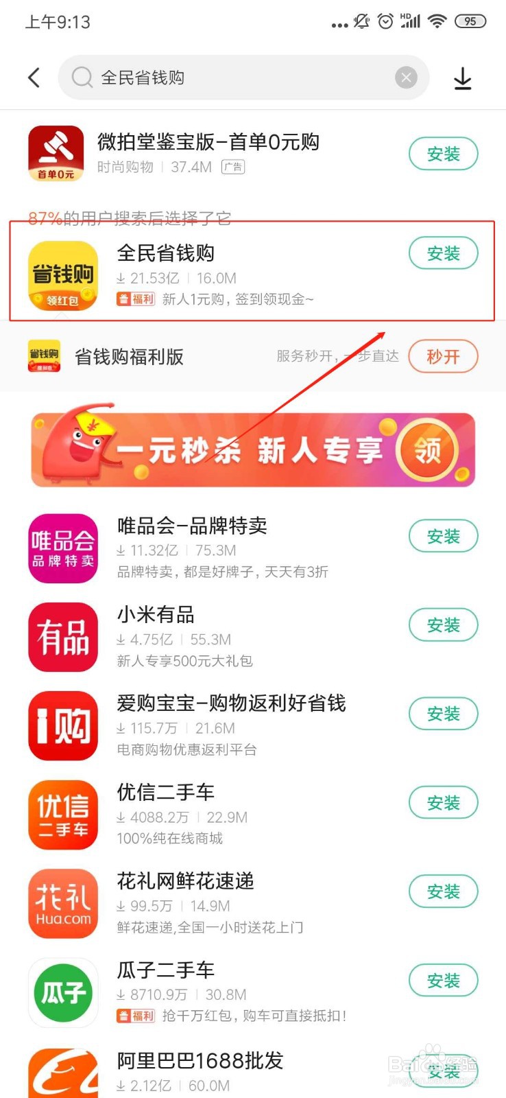 4、在全民省钱购下载页面里,看箭头指向点击“安装”,稍微等一下就下载完成了。
