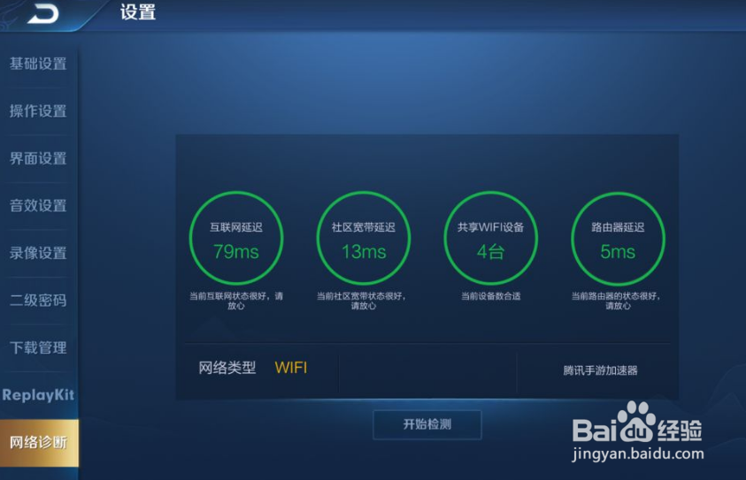 调整完游戏画面设置,对网络进行检测,在下方网络诊断中,利用王者荣耀的自带工具对网络情况进行检测。