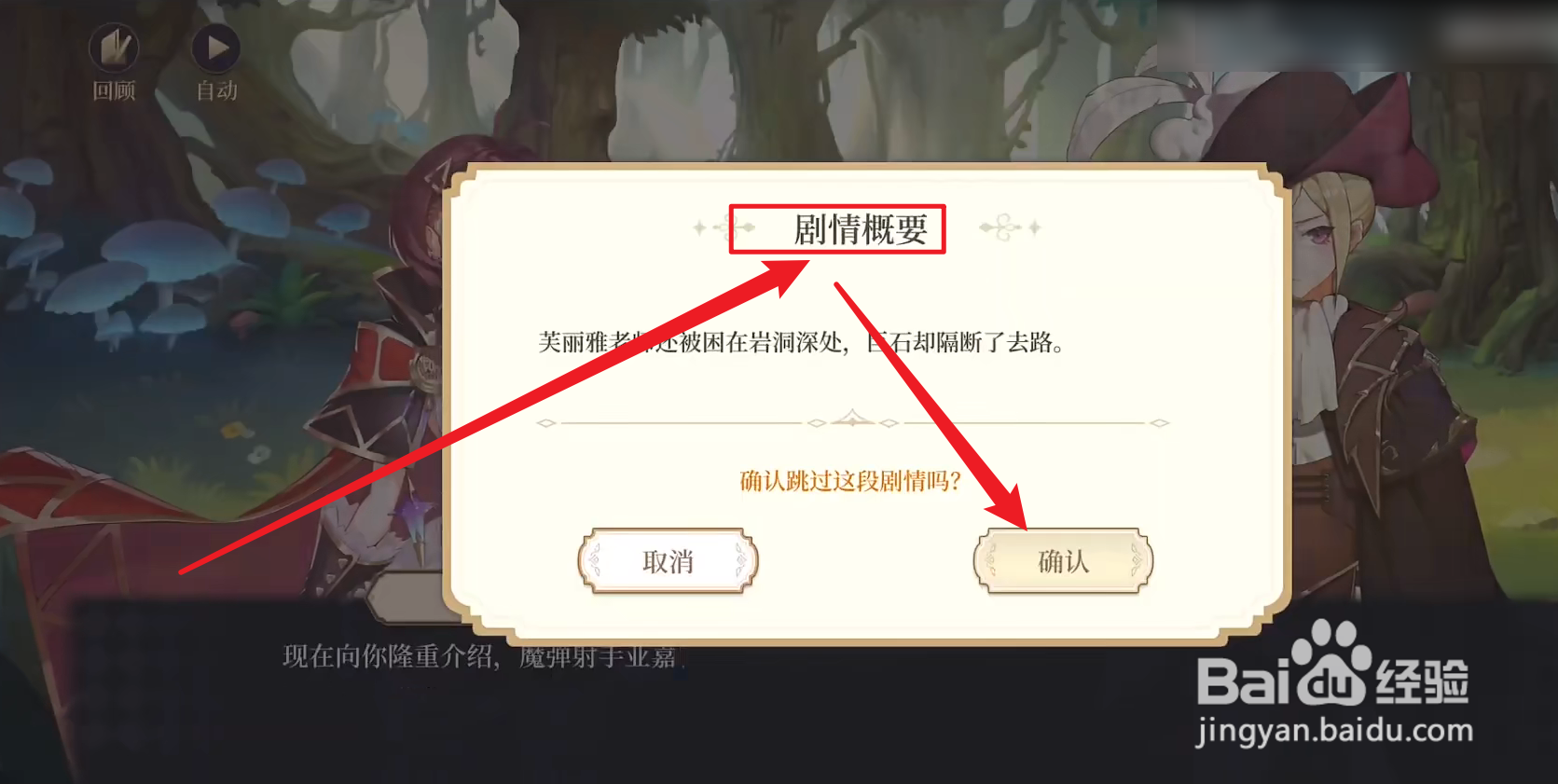 2、然后查看【剧情概要】并点击【确认】跳过剧情触发战斗