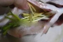 3、其次,将料酒,盐往桂鱼身上涂抹,涂抹均匀后在将其腌制十五分钟,再将姜片,葱放进桂鱼的肚子里。