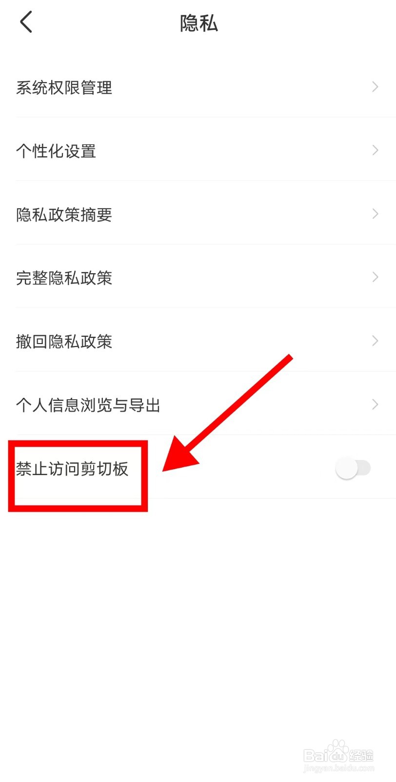 3、接着,在【隐私】界面点击【禁止访问剪切板】,如下图。
