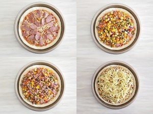铺上黑胡椒脆皮肠薄片,撒上炒过的蔬菜,再撒上脆皮肠粒,最后铺满马苏里拉奶酪。