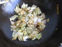 6、加入葱姜蒜煸炒香,然后入白菜帮翻炒;
