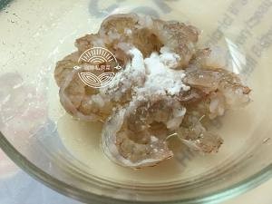 2、清洗虾仁:入少许盐和淀粉,顺时针轻揉,揉出虾仁身上的粘液。