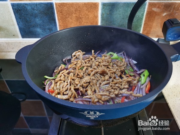 2、马克西姆微压锅提前烧热,锅中放入少量的植物油,将腌好的肉丝放入锅中,炒到肉丝变色盛出来备用。马克西姆微压锅是不粘锅,油量可以比平常少一点。