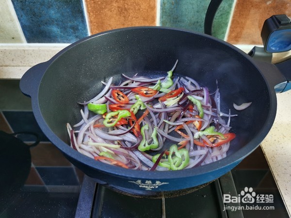 3、根据情况再添少许油,然后将切好的洋葱丝放入锅中大火翻炒两分钟。