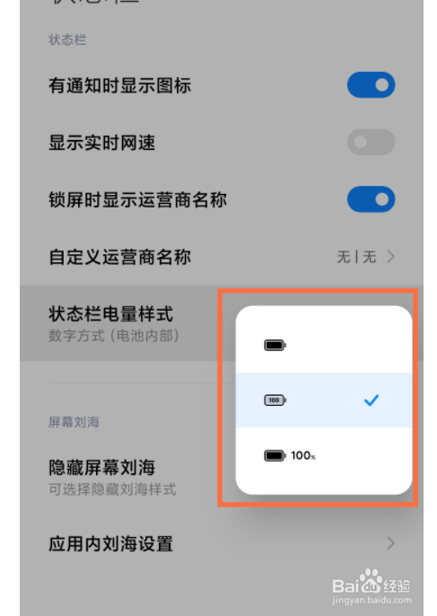 3、点击【状态栏电量样式】,再点击自己喜欢的电量百分比样式即可。