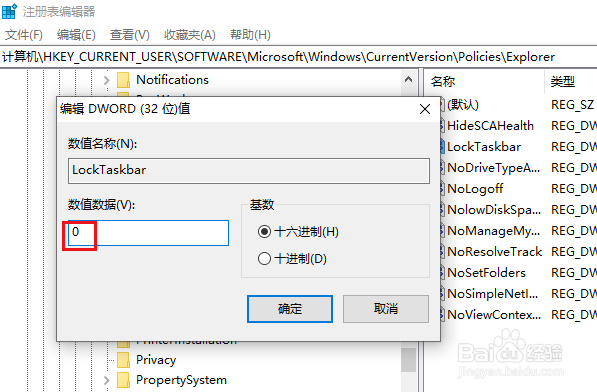 3、将数值数据更改为“0”,点击确定,关闭注册表窗口。您可以立即看到"锁定任务栏"已恢复正常状态。