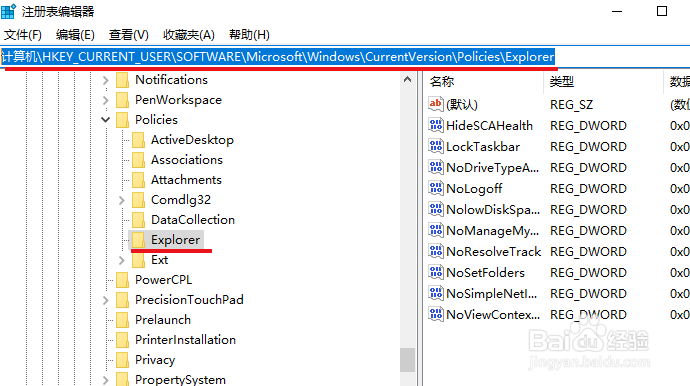 1、打开注册表编辑器导航到,计算机\HKEY_CURRENT_USER\SOFTWARE\Microsoft\Windows\CurrentVersion\Policies\Explorer