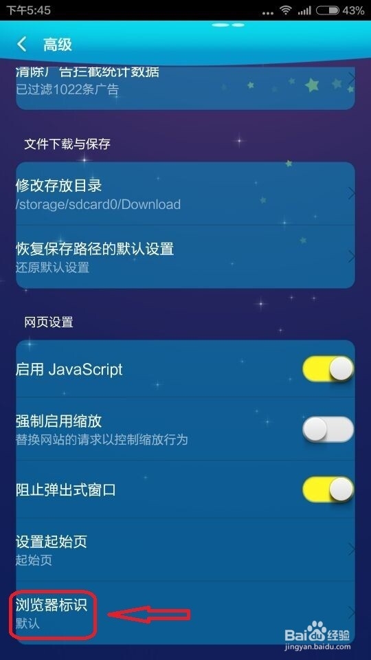 4、如图,找到“浏览器标识”,此时显示“默认”,是手机模式,我们要做的就是把手机模式改为电脑模式。点击进入