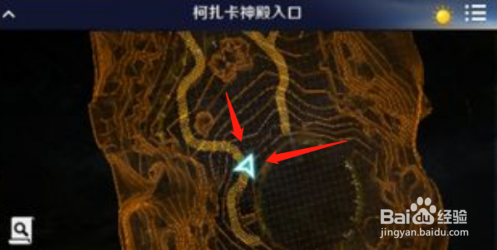 2、其次,来到“柯扎卡神殿入口”后,通过游戏小地图,找到图示标注点位置。
