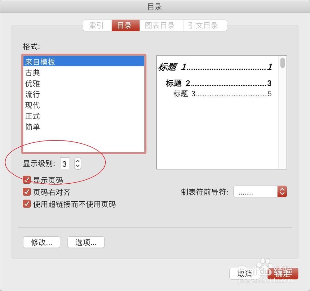 6、设置为1,点击确定,那么即可生成目录。由于这个忘记点击了空白页,因此目录在当前页生成了的,这个需要注意一点。