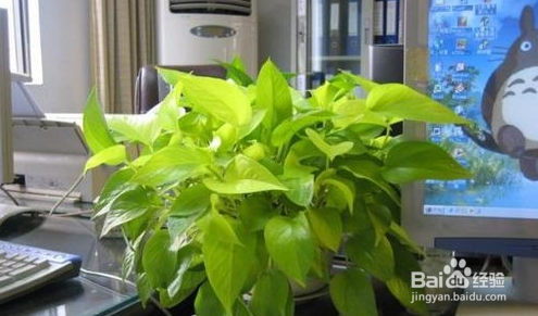 6、黄金葛,这种植物通过光合作用,可以将屋里面的一些有毒的气体以及电脑辐射,分解成为植物自用的一些物质,而且这种黄金隔夜子非常的漂亮装饰性很强,可以直接处于吊盆外面。