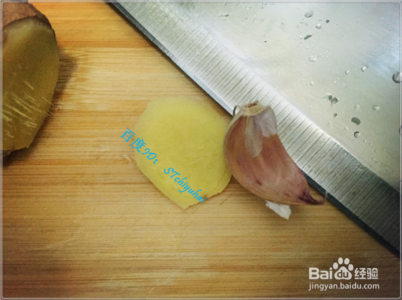 准备少许其他佐料,蒜头和生姜,将生姜去皮然后切成丝状;蒜头去除蒂头,然后用菜刀侧拍,将其拍碎然后去除外皮。