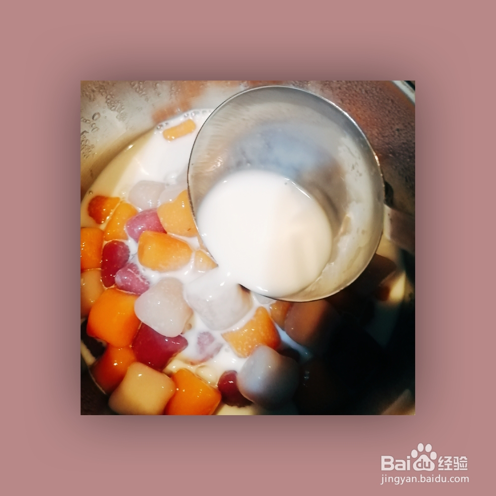 5、加热并溶解两瓶牛奶?加冰糖椰奶,然后倒入准备好的西米和芋头球。