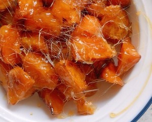 6、用筷子蘸取锅里剩余的糖浆,挂在红薯上,快速拍打出糖丝装饰一下!吃的时候准备一碗凉水,把红薯放进去再拿出来吃,红薯表面的糖浆迅速变得酥酥脆脆~外脆里糯。